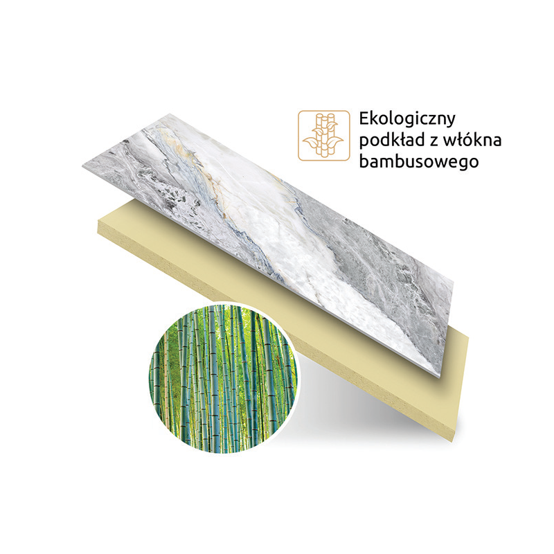 Rdzeń z bambusowego włókna węglowego: Innowacyjna technologia WPC gwarantuje, że płyta jest lekka (ok. 10 kg) i elastyczna, co eliminuje ryzyko pęknięć typowe dla naturalnego kamienia czy spieków.